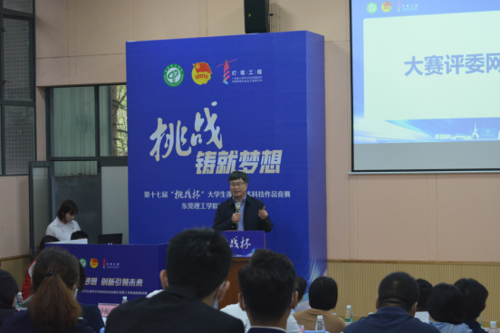 授旗仪式结束后,主持人本届挑战杯备赛情况进行了介绍,并邀请本次大赛的评委代表广东省社会科学院原企业所所长林平凡进行网评点评。本次大赛共有210件作品报名参加,其中A21件,B118件,C71件。经过各二级学院遴选报送以及校外评审专家网评,共评选出59件优秀作品进入学校选拔赛决赛。评委代表林平凡对本次大赛进行点评并提出建议,强调扎实的专业知识是创新创业项目的基础以及对作品进行精心打磨的重要性。