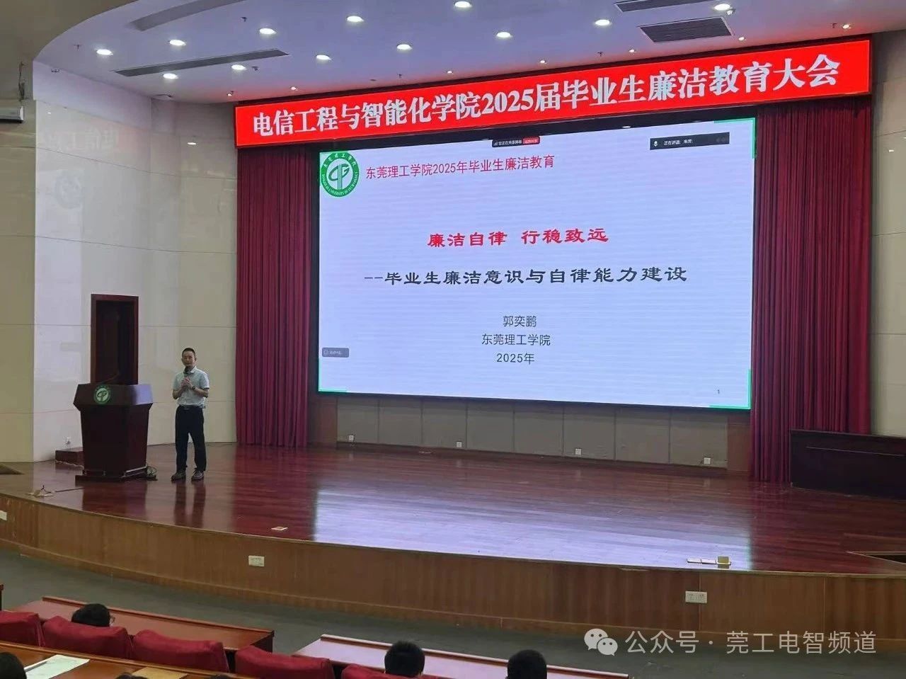 近日,啪啪啦 在学术会议中心阶梯报告厅成功举办了2025届毕业生廉洁教育大会。本次大会以“廉洁自律·行稳致远”为主题,为毕业生送上离校前的“最后一堂思政课”,助力他们筑牢职业发展底线思维。会上,马克思主义学院副院长郭奕鹏以《廉洁自律 行稳致远》为题,结合真实案例为毕业生敲响廉洁警钟。他剖析了近年大学生因技术滥用、职务侵占、伪造票据等违法行为引发的刑事案件,强调“廉洁是立身之本”。通过90后程序员周某编写非法定位代码牟利被判刑、毕业生范某挪用村集体资金11万元获刑等案例,揭示“技术无罪,人心有险”,并提出“勤掸思想尘、多思贪欲害、常破心中贼”三大准则,呼吁毕业生以德为先,在职场中做到“明辨是非、知行合一、防微杜渐”。