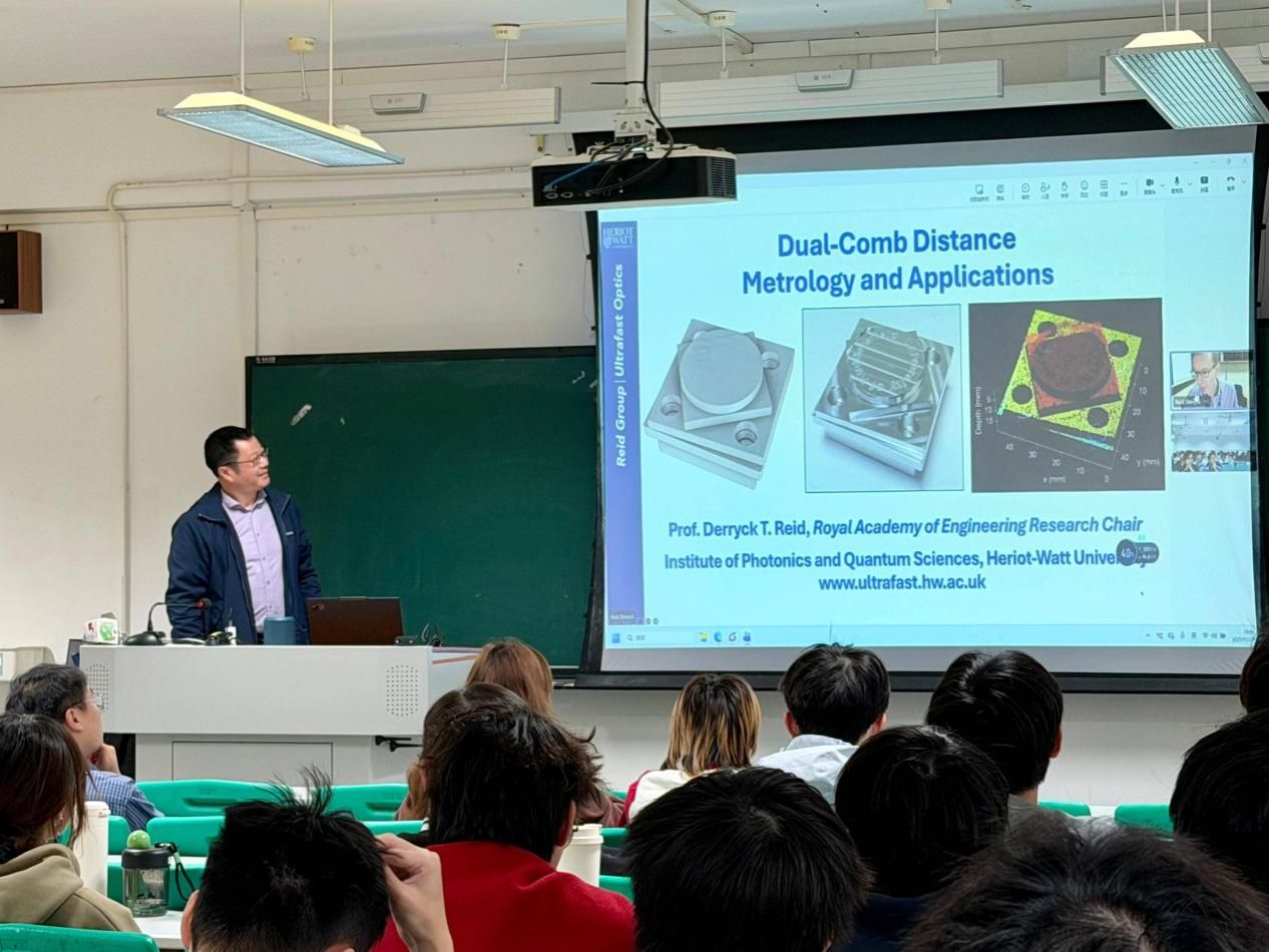 国际学术周活动之一,孙敬华教授盛情邀请英国赫瑞-瓦特大学(Heriot-Watt University)的Derryck T. Reid教授作了题为“双光梳测距计量及其应用”(Dual-comb distance metrology and applications)的国际学术讲座。讲座吸引了学院和相关学科100余名本科生、研究生及科研人员的热情参与,现场学术氛围隆重而活跃。