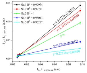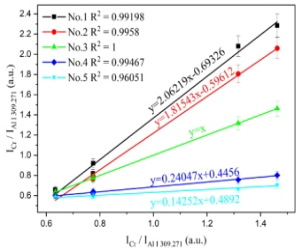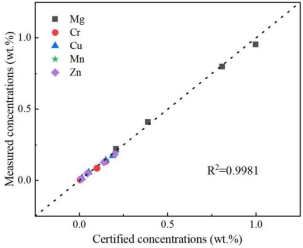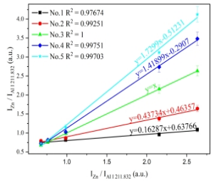 该文章研究了将飞秒激光剥离-火花诱导击穿光谱技术(femtosecond laser-ablation spark-induced breakdown spectroscopyfs-LA-SIBS)与单标样和多谱线定标方法One-point and multi-line calibrationOP-MLC相结合,对铝合金样品中微量元素定量分析的可行性。该方法只需一个标准样品即可对未知样品元素进行定量分析,它利用未知样品与标准样品中分析元素的多条特征谱线强度获得线性拟合斜率,利用该斜率值和标准样品元素含量值就可计算出未知样品元素含量。该研究实现了对铝合金中的微量元素MgCrCuMnZn的定量分析,对此方法进行了验证。结果如图1和图2所示,该方法可实现低含量元素的精准定量分析,无需对所含元素含量的归一化处理,不同元素分析结果互不影响;对5个铝合金测试样品中痕量元素MgCrCuMnZn的定量分析平均相对误差分别为6.428.121.919.020.0%。该方法为fs LA-SIBS技术进行快速定量分析提供了便捷的方法。(文章链接://www.sciencedirect.com/science/article/pii/S0003267022011849?via%3Dihub