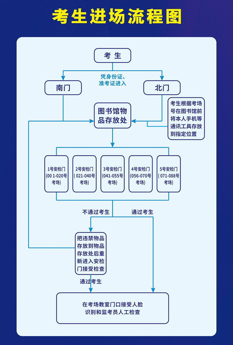考试当天学校北门、南门作为考生进校通道,每场考试开考前70分钟开放进校通道。考生到达考点后,在工作人员的引导下,有序排队,凭本人准考证、有效居民身份证进入考点。