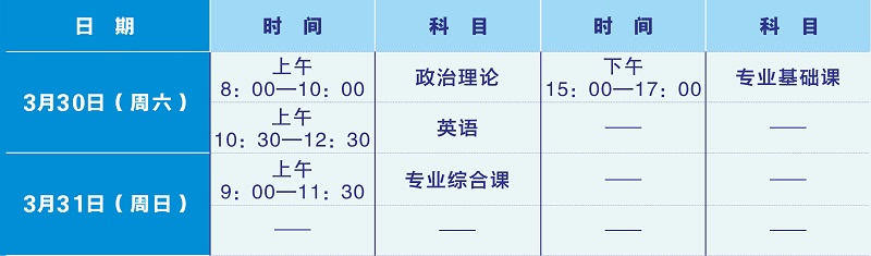 注:由我校自行组织命题的专业综合课科目考试、退役大学生士兵综合考查考试将于4月6日举行,具体内容另行通知。