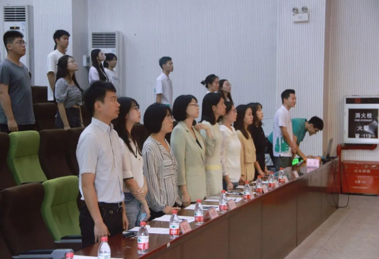 仪式在庄严肃穆的国歌声中拉开的帷幕,全体成员起立、高唱国歌。