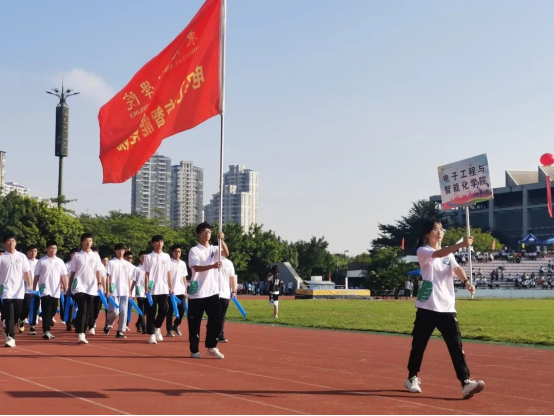 激昂的进行曲点燃运动会的序幕,英姿飒爽的电智代表团,迎着晨光向大家走来,一面面红旗舞动着属于电智人的骄傲和自豪!一张张坚定的面孔。他们,嘴角微微上扬;他们,挺拔着身姿;他们,大声呐喊着响亮的口号:“志当存高远,无愧电智人”!