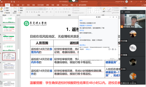 学生特点完善学生返校指引PPT,做好政策解读和教育引导工作;二是精准摸排、建立台账,通过前期学生健康打卡信息做到准确摸清学生返校前14天的行程信息、建立精准台账;三是在学生返校3天中,辅导员实行“一人一岗、一岗双责”,做好服务与管理工作。梁意红还要求辅导员关注疫情走向,清醒把握疫情防控各项措施的动态变化,增强预判能力,掌握工作主动。