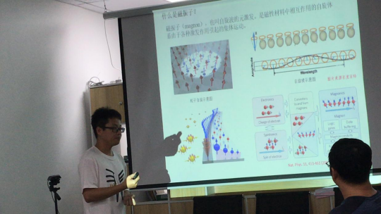 首先由去年国家自然科学基金青年基金项目获得者刘增星讲师为大家分享了近期研究工作进展,作了题为《磁振子耦合系统中的相关非线性效应研究》的报告。他首先简要介绍了何为磁振子(magnon)并指出磁振子在后摩尔时代光电子器件的发展中作为信息载体在未来的通信技术有着广阔的应用前景。此外,报告人还展示了目前国际国内上有关磁振子的研究在自旋电子学和未来器件领域的一些重要进展结合自己的相关工作,分享了他在磁振子耦合系统中的相关理论研究及其应用。