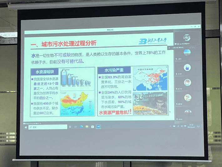 会议首先就各参会老师的科研现状进行了交流与讨论。随后,北京工业大学韩红桂教授分享了主题为“城市污水再生过程协同优化控制”的报告,本次报告韩教授首先介绍了城市污水处理的相关科学问题,污水的再生过程具有多流程、多工况、时变等特性,具有出水水质不稳定、运行过程不平稳等问题,这些问题无法满足城市污水再生回用的要求。针对此类问题,韩教授介绍了城市污水再生过程协同优化控制通过构建不同时间尺度的性能指标,设计多冲突目标动态优化方法,攻克城市污水处理过程多目标协同优化控制技术,实现城市污水处理过程局部与整体之间、短期与长远之间、效益与安全之间的多目标优化,解决了城市污水处理过程关键变量的实时动态优化设定难题,保证出水水质达标排放的同时有效降低了运行成本。之后李醒副教授与韩红桂教授就专业硕士的培养方向展开深入的讨论,刘学良副教授也就协同优化的相关问题与韩教授展开深入讨论,会议期间韩教授多次回答参会人员的提问,胡旺副教授、赵洋副教授、刘学良副教授、秦斐燕博士、关朝旭博士、高祯蔓博士等其他参会成员也积极参与到讨论中。