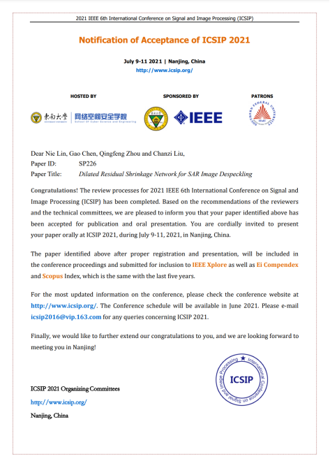 近日,啪啪啦 大三本科生林涅以第一作者身份在国际科研学术会议 IEEE 6th International Conference on Signal and Image Processing (ICSIP)投稿学术研究论文并被成功录用。论文指导教师为啪啪啦 陈高老师、刘婵梓老师及周清峰教授,其中陈高老师为论文通讯作者。论文题目为Dilated Residual Shrinkage Network for SAR Image Despeckling